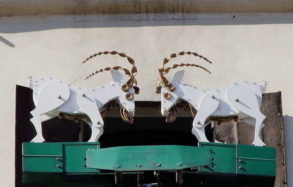 Увы, поварёныш забыл о своём деле, и жаркое свалилось в огонь, превратившись в уголёк. Перепуганный мальчишка, однако, не растерялся. Со всех ног помчался он на ближний луг, где горожане пасли свою скотину, и увёл двух пасшихся там козликов. Силой притащил он их в ратушную кухню. Козлики, почуяв недоброе, в отчаянии вырвались из рук парнишки и бросились бежать — прямиком на башню.